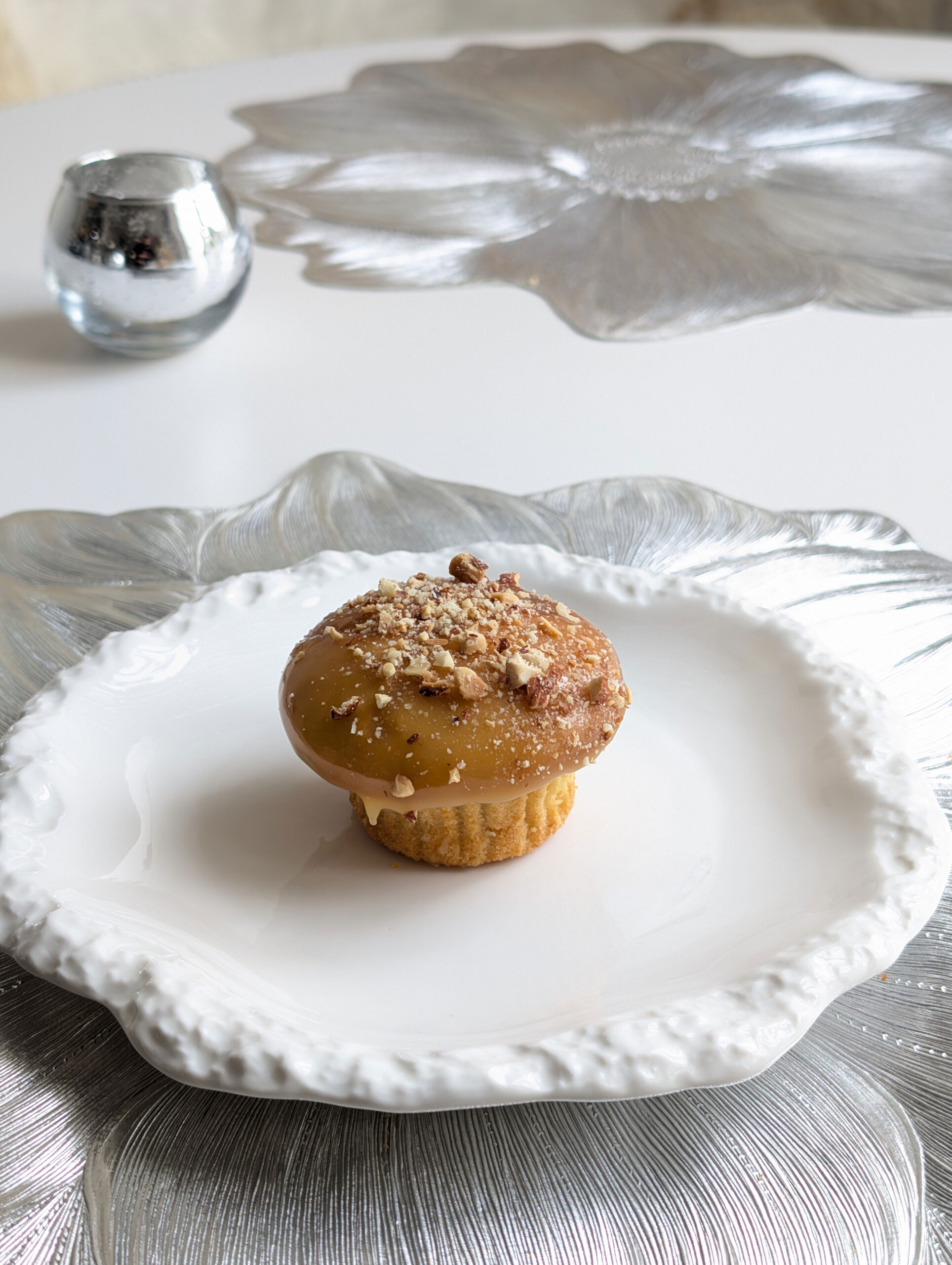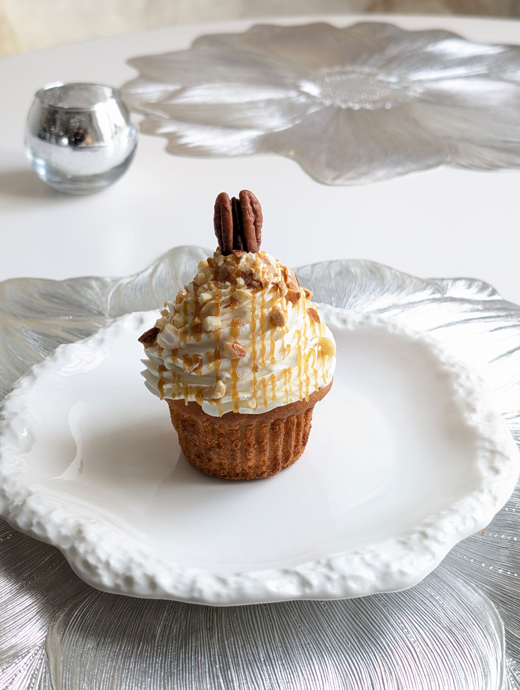 自慢のマフィンにたっぷりの生クリームを絞り、キャラメルソースをかけ、仕上げに大粒のピーカンナッツ、アーモンド、カシューナッツ、くるみを贅沢にトッピング。